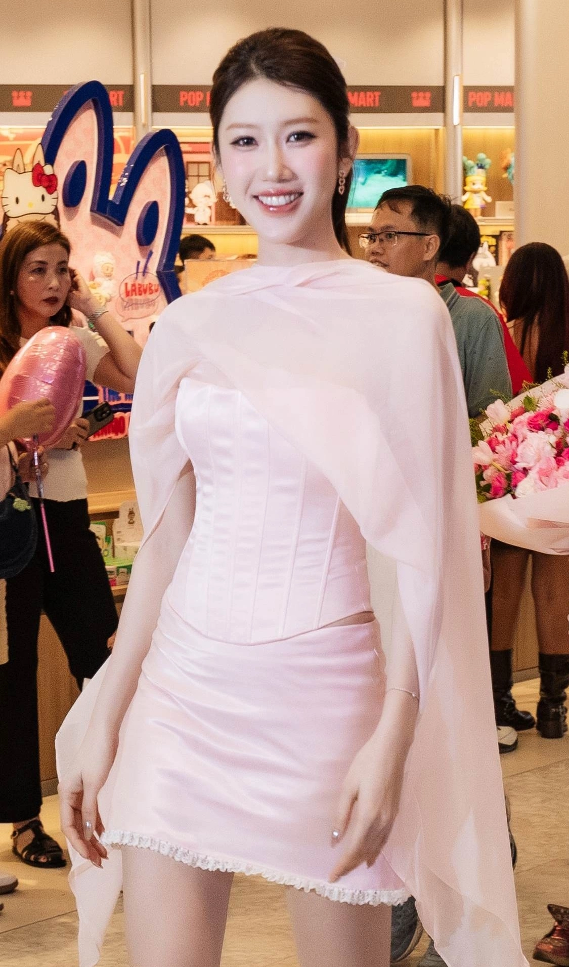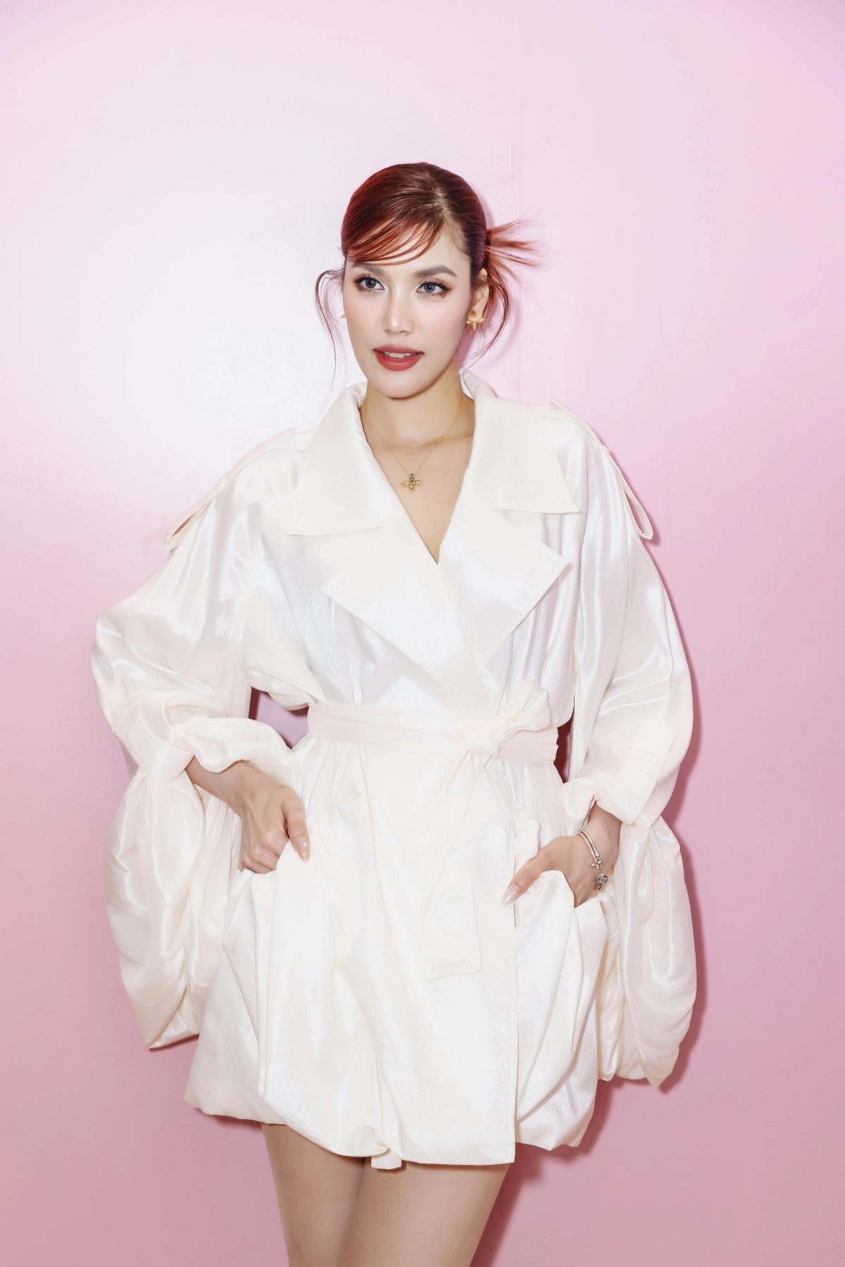 Diễn viên Thúy Ngân chọn đầm hồng pastel tôn dáng.