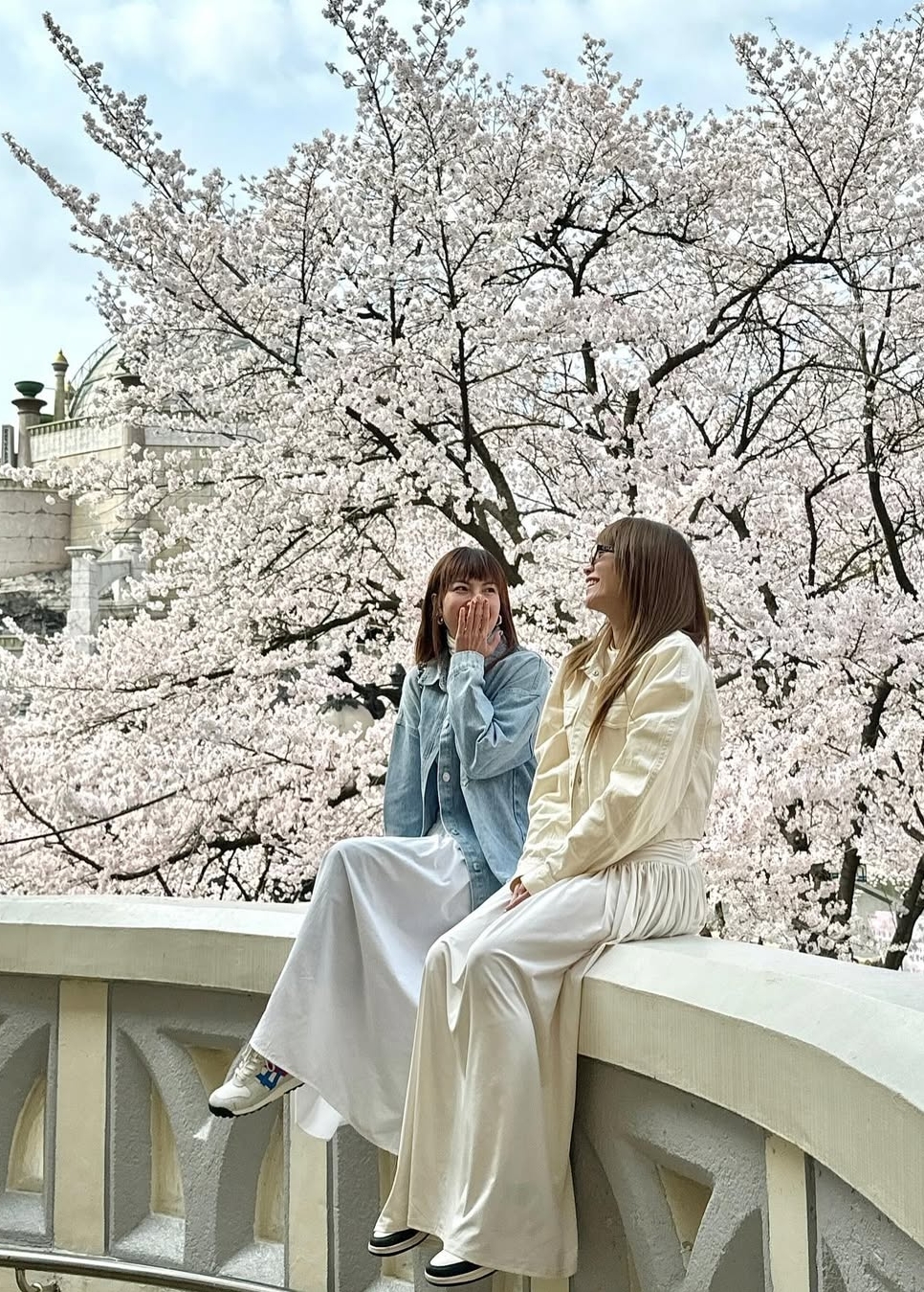 Khi đi du lịch Hàn Quốc, họ cùng chọn áo khoác denim kết hợp váy maxi và sneakers.