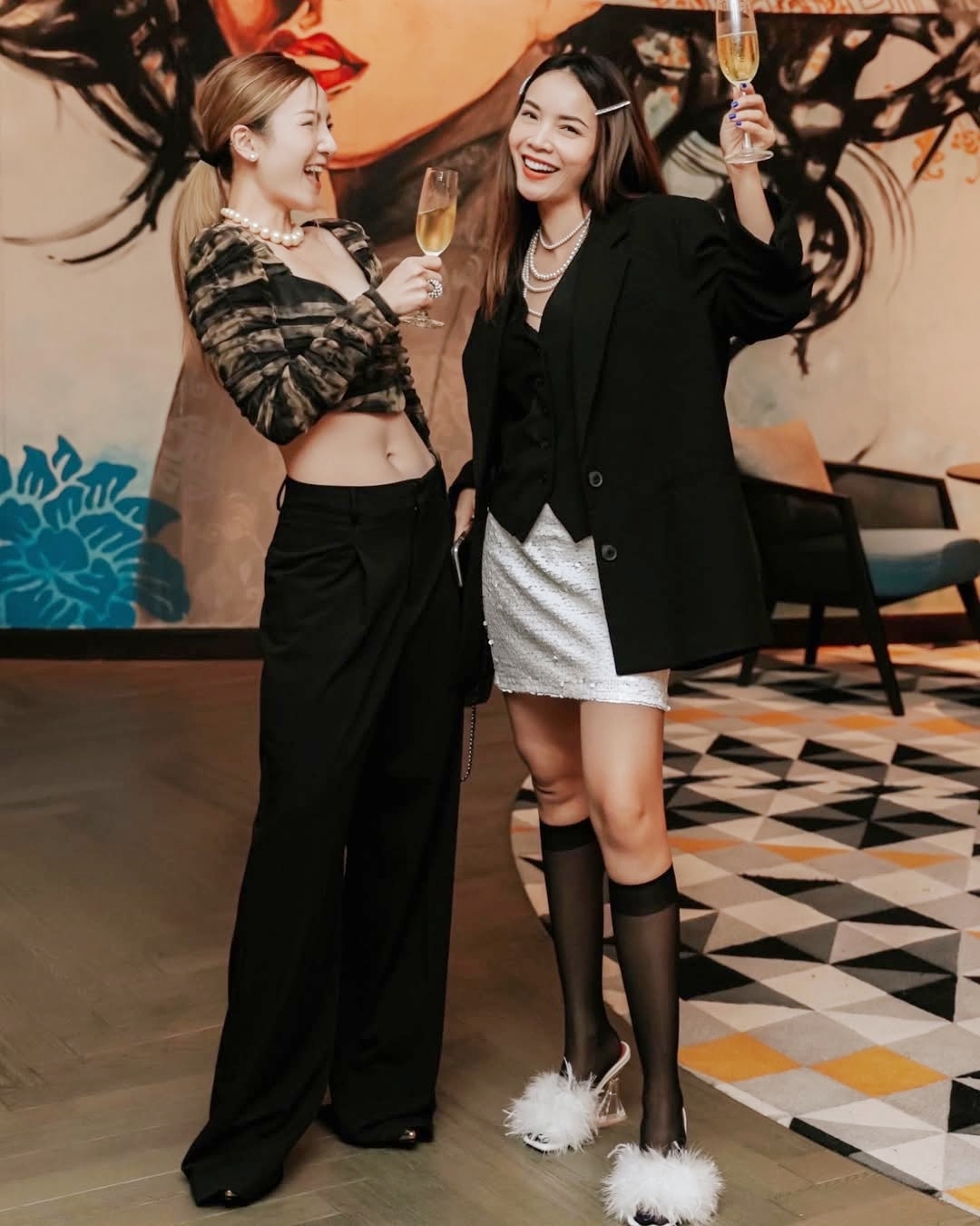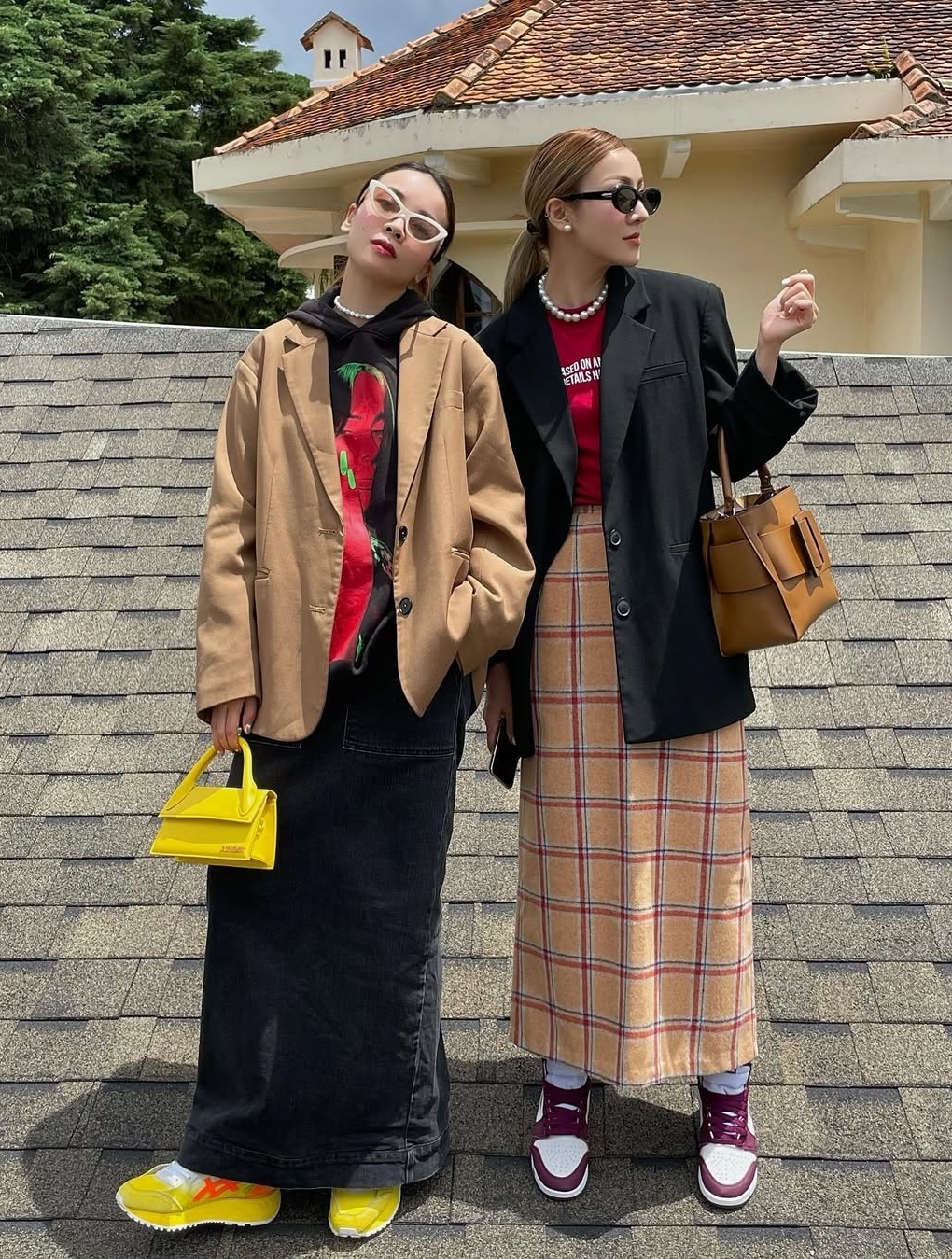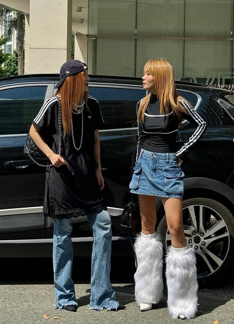 Trước đó vài ngày, cả hai mặc bộ áo yếm giống nhau, chỉ khác màu. Họ để tóc đuôi ngựa, đeo trang sức bản lớn theo phong cách thập niên 1980.