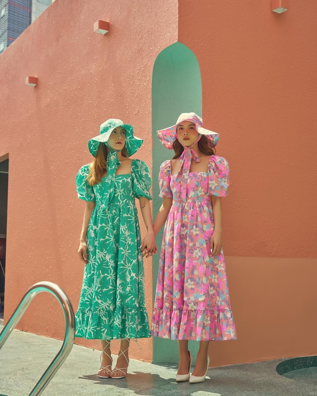 Hai người đẹp phối váy hoa tay bồng đồng điệu mũ tai bèo. Yến Nhi gợi ý kết hợp sandals quai mảnh, chị gái cô chọn giày cao gót mũi nhọn.