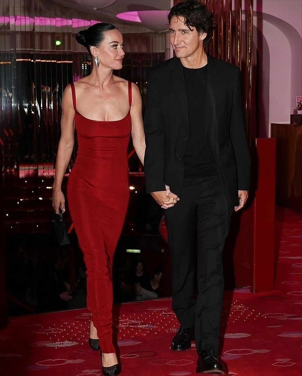 Tại một sự kiện cuối tháng 3, cả hai diện đồ đôi với tông đen đơn sắc, phong cách tối giản. Katy tôn dáng trong đầm quây ngực dáng cột, tiết chế trang sức. Ông Trudeau chọn vest hiện đại và áo thun cùng tông.