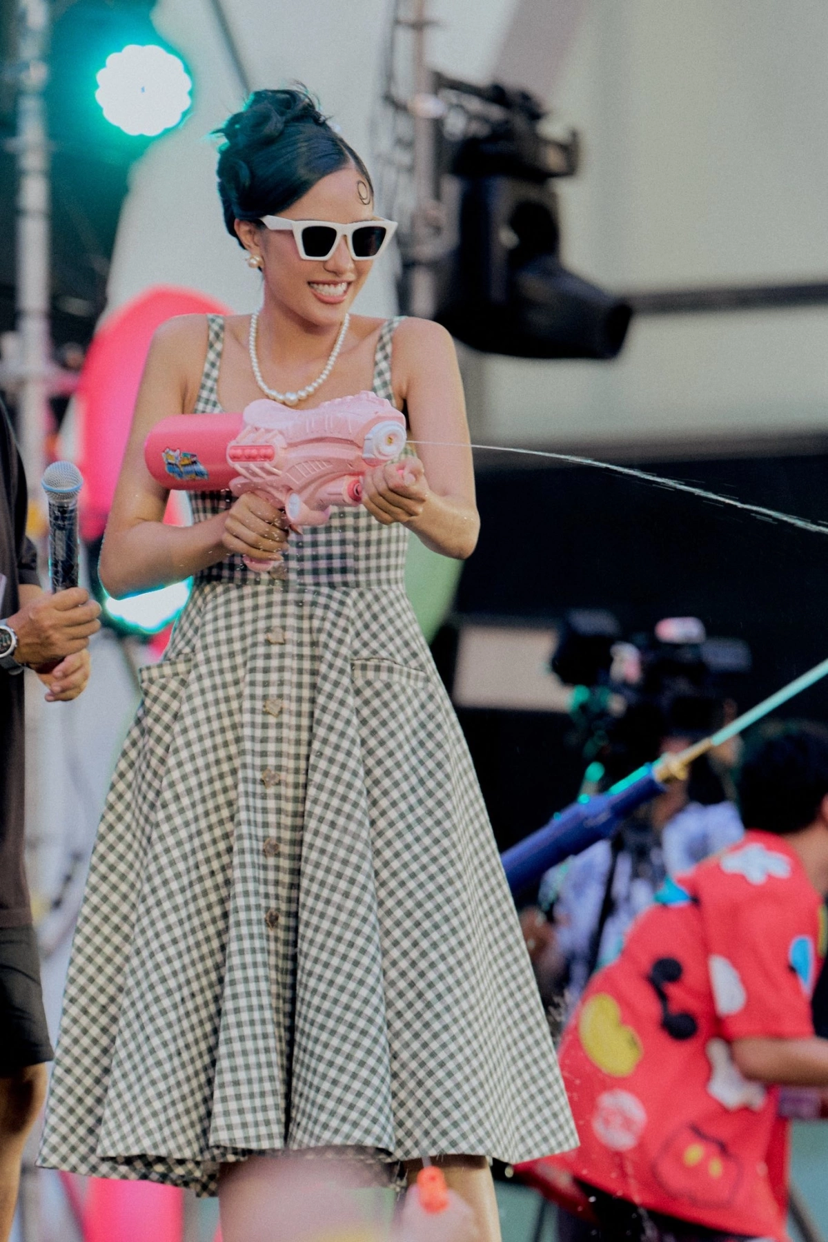 Opal Suchata tham gia hoạt động tại quảng trường CentralWorld, ngày 14/4. Cô diện trang phục thoải mái, chơi bắn súng nước cùng hàng nghìn người.