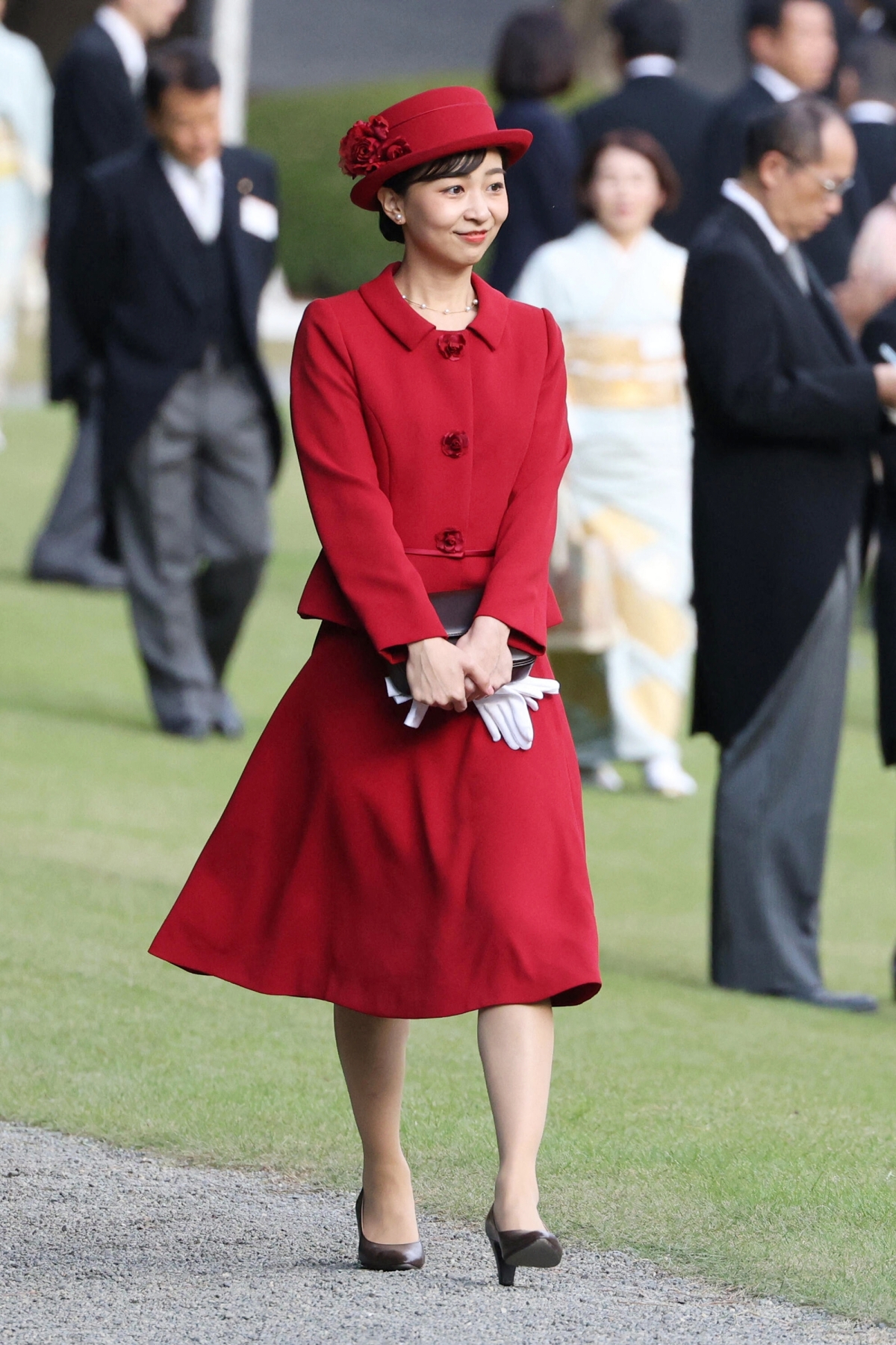 Tham dự tiệc mùa thu ở Vườn Hoàng gia Akasaka tháng 10/2025, công chúa gây ấn tượng bằng bộ váy áo màu đỏ dáng thắt eo nhẹ, kết hợp mũ fedora cài hoa.