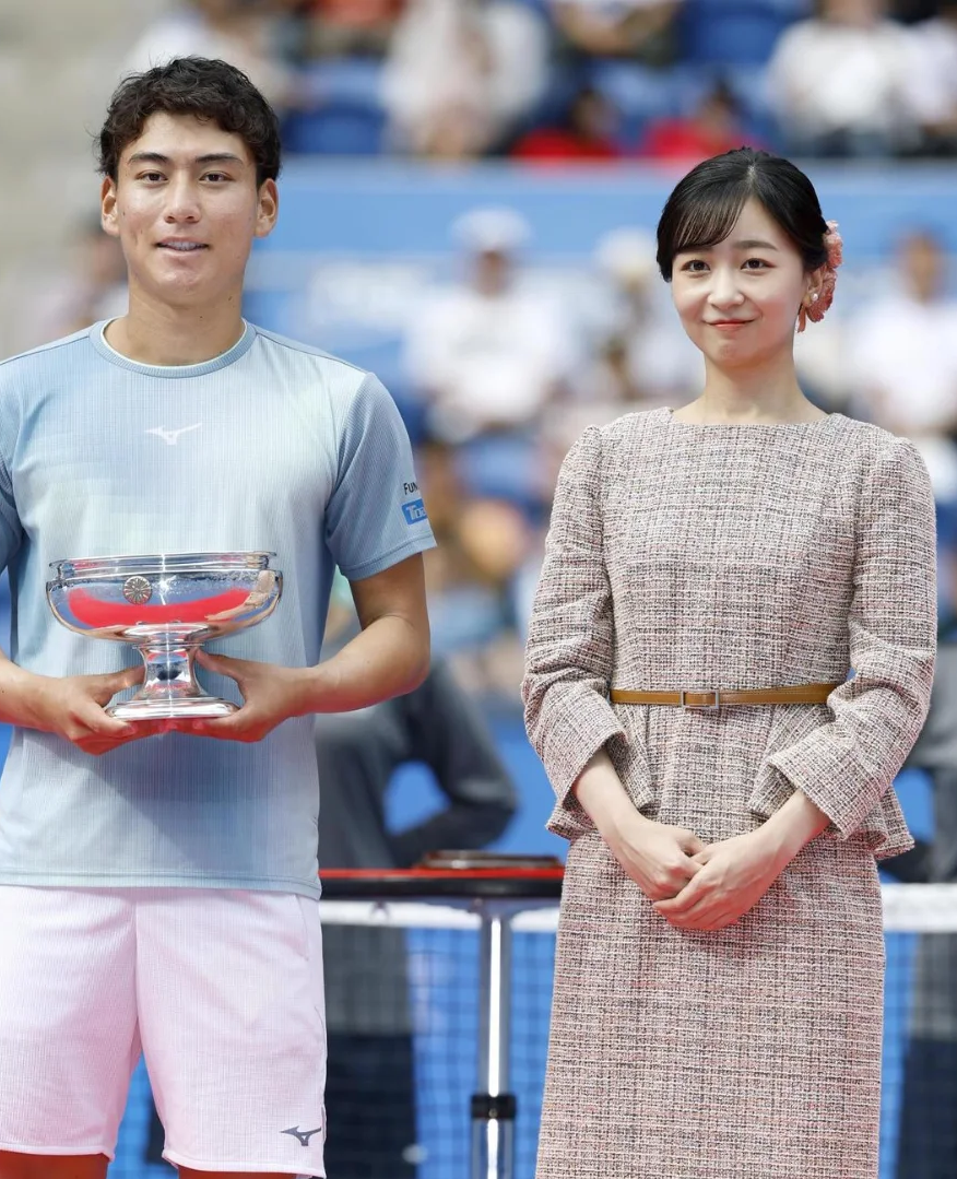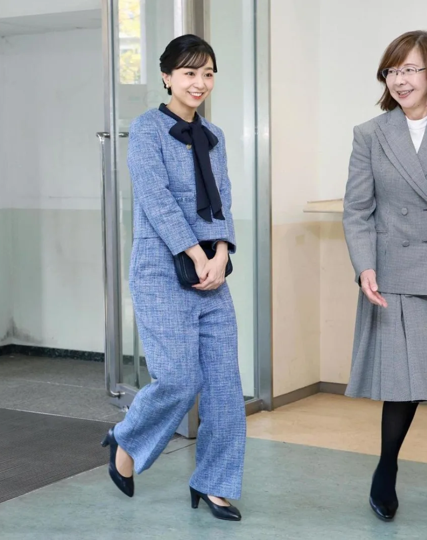 Đến trao cúp cho giải vô địch quần vợt toàn Nhật Bản tháng 10/2025 tại Tokyo, cô chọn váy suông bằng tweed mỏng dáng peplum, kèm đai lưng, giúp tạo tỷ lệ cơ thể cân đối. Công chúa tô điểm bằng những chiếc kẹp hoa – phong cách cô ưa chuộng, thường xuyên sử dụng.