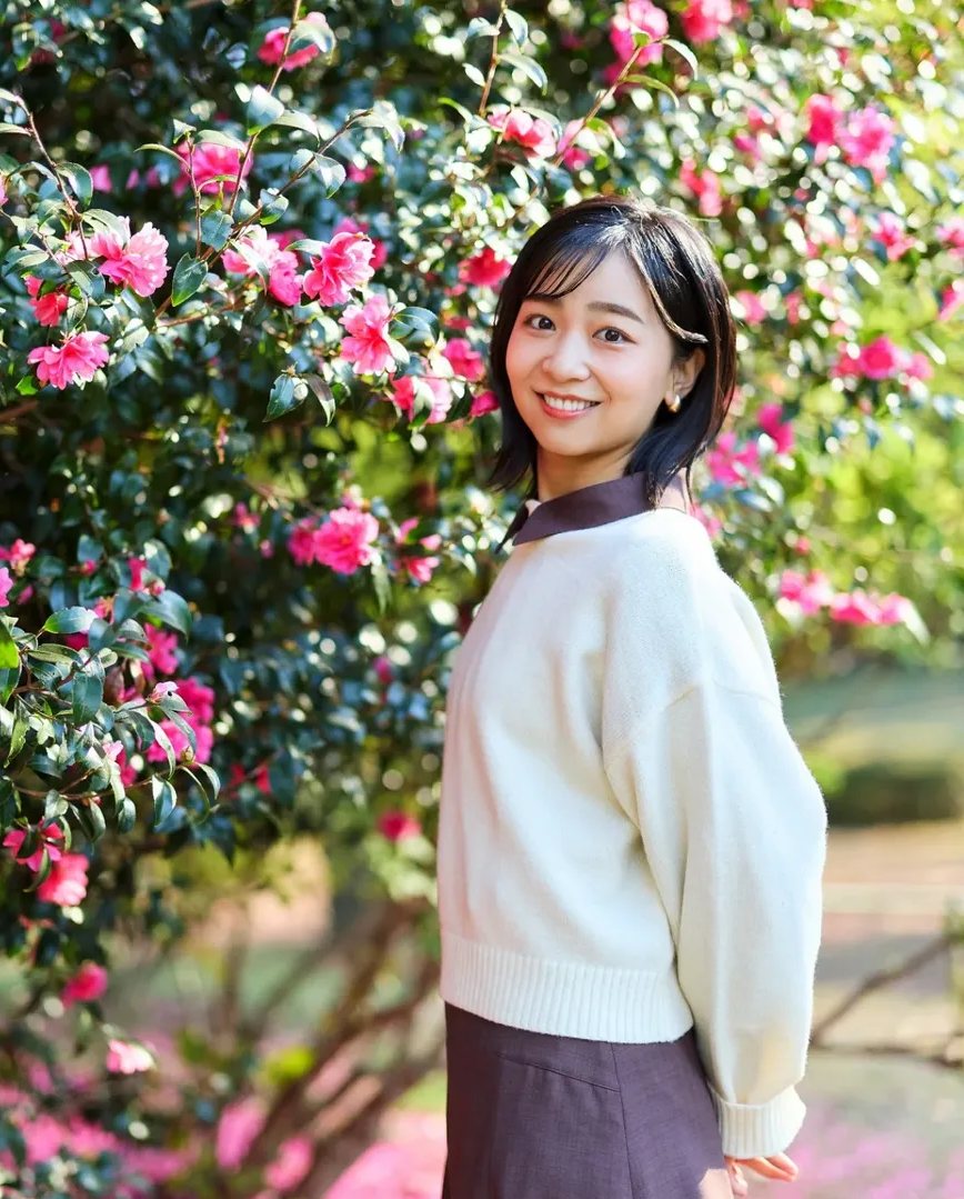 Dịp sinh nhật cuối tháng 12 năm ngoái, cô phối áo len trắng và váy sơ mi tím đậm chụp ảnh bên hoa tại Vườn Hoàng gia Akasaka.