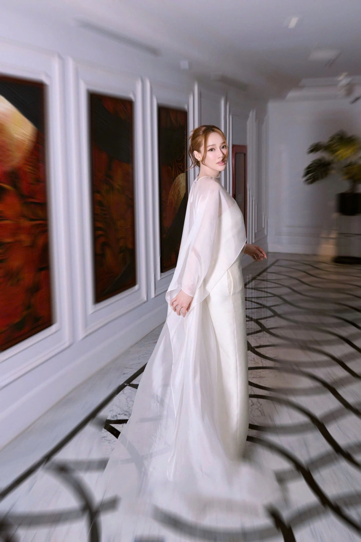 Cô chọn đầm lụa dáng cape khi đến chúc mừng ông xã Trường Giang ra mắt phim điện ảnh đầu tay Nhà ba tôi một phòng, ngày 13/2 ở TP HCM.