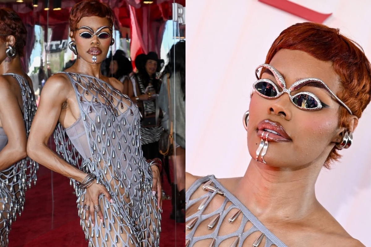 Teyana Taylor diện phong cách vị lai với váy lưới khoe bodysuit xuyên thấu, kính và trang sức môi. Ảnh: Instyle