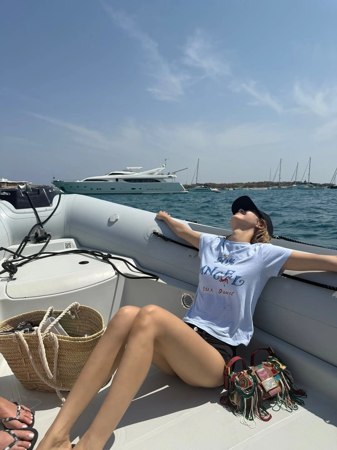 Trên du thuyền, cô chọn trang phục gọn gàng gồm quần shorts và áo phông để thuận tiện trong các hoạt động.