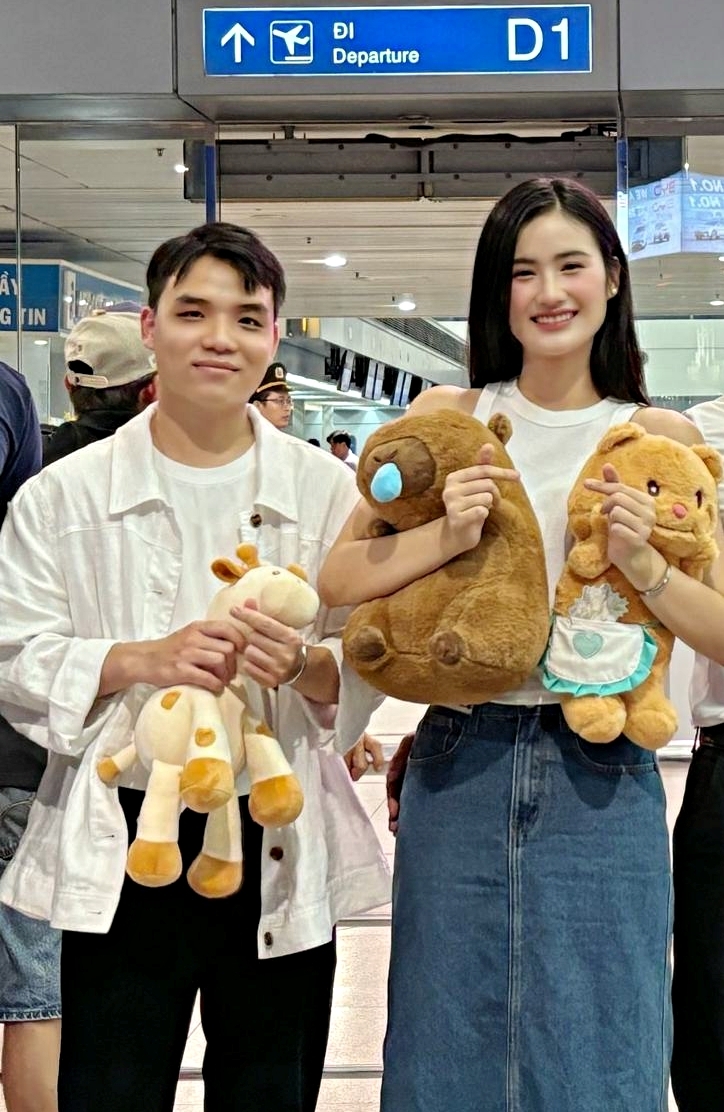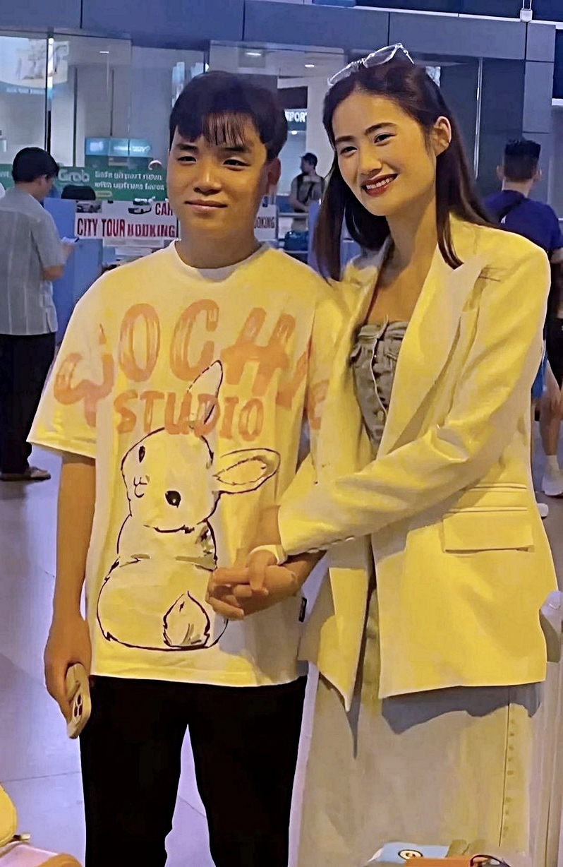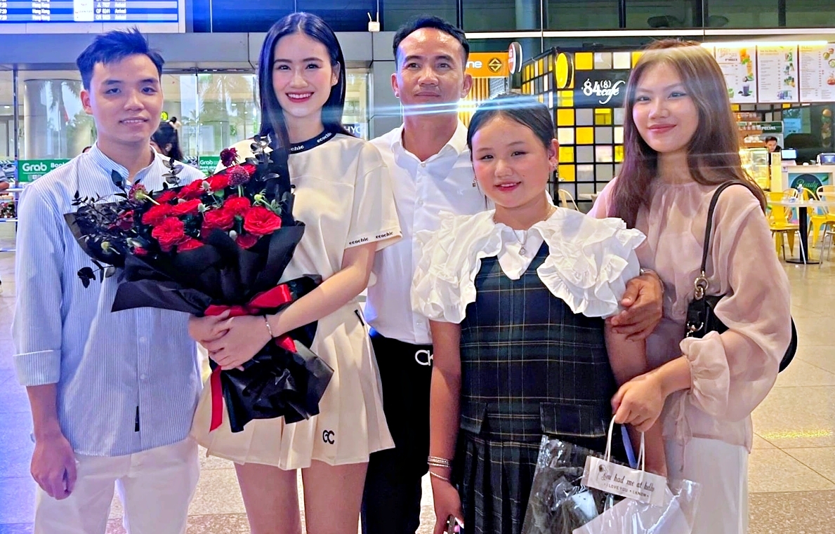 Anh Kiệt cùng người thân đón Ý Nhi từ Australia về nước sau tám tháng du học tại Đại học Sydney hồi tháng 6/2024. Bạn trai hoa hậu kết hợp sơ mi caro với quần kaki, Ý Nhi phối chân váy xếp ly cùng áo thun theo phong cách nữ sinh.