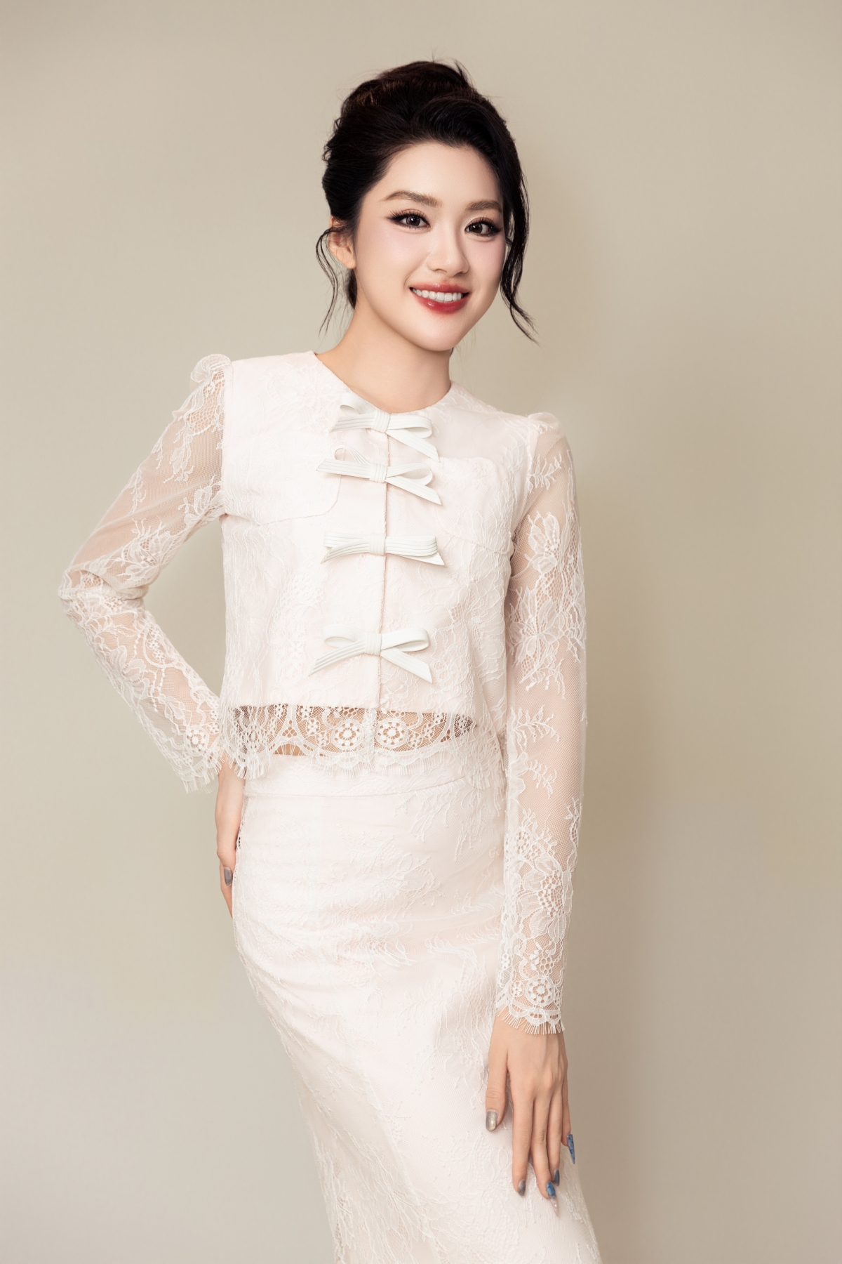 Trang phục đắp ren, đính kết hoa, nơ khiến vẻ ngoài của Phương Oanh bớt đơn điệu.