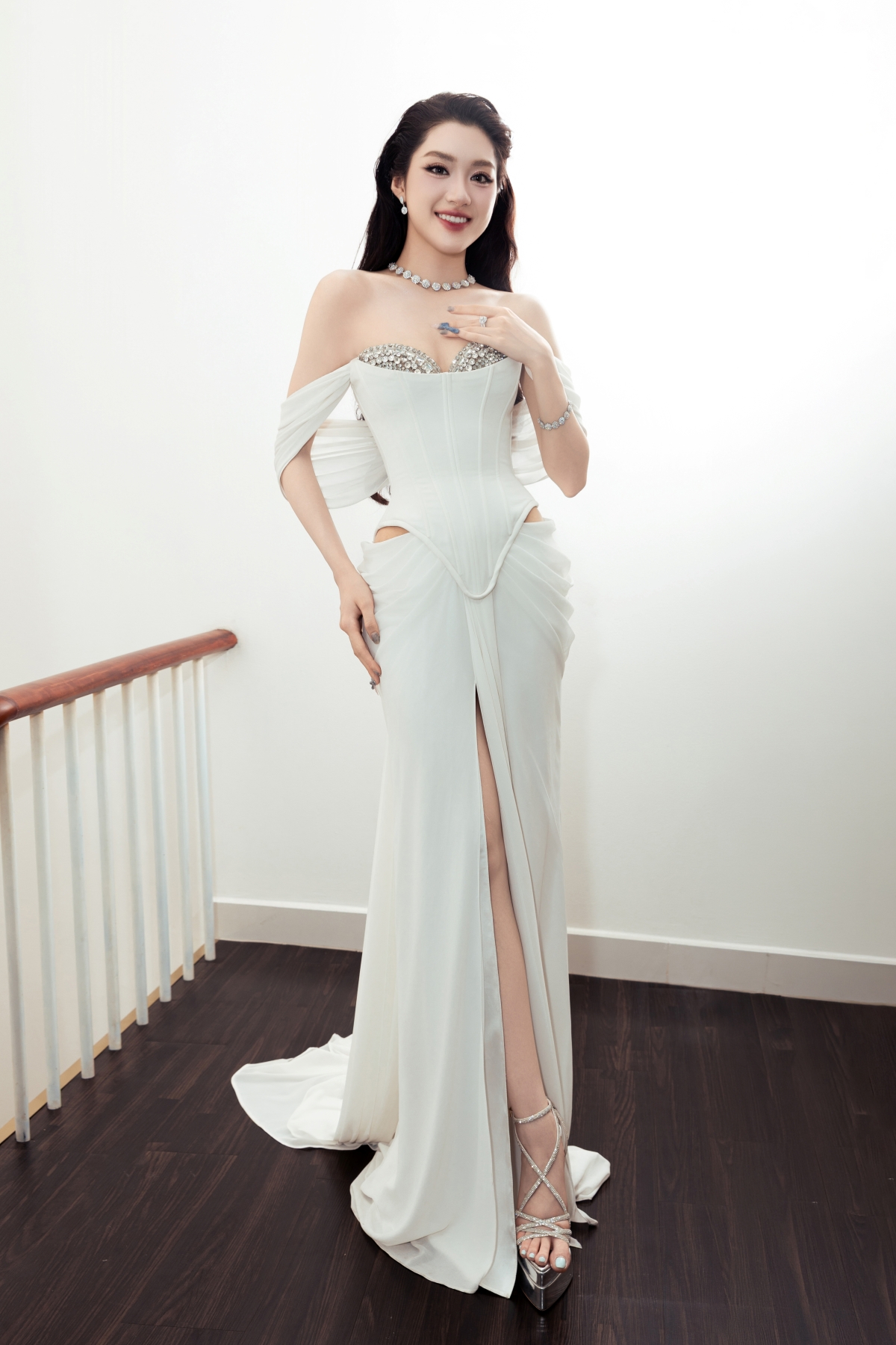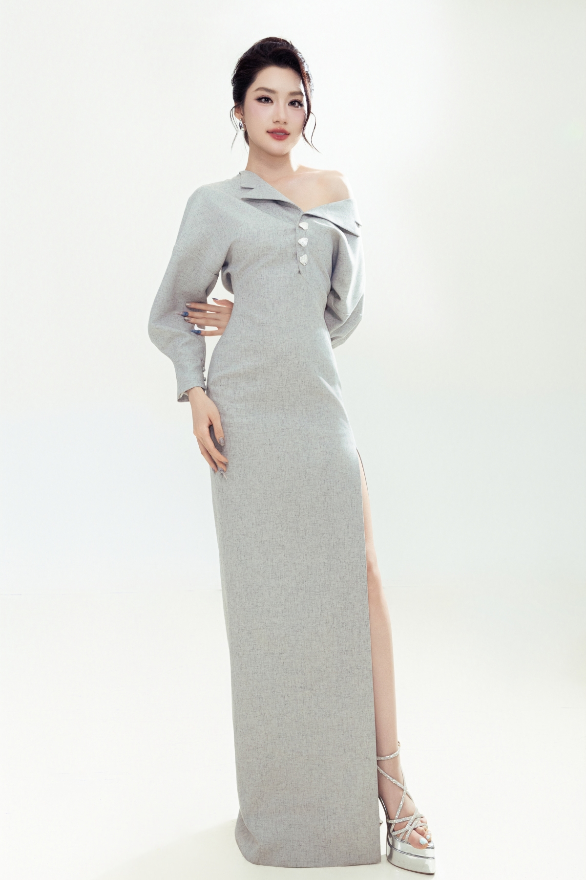 Hoa hậu trong kiểu đầm xẻ tà tôn ưu điểm chân thon.