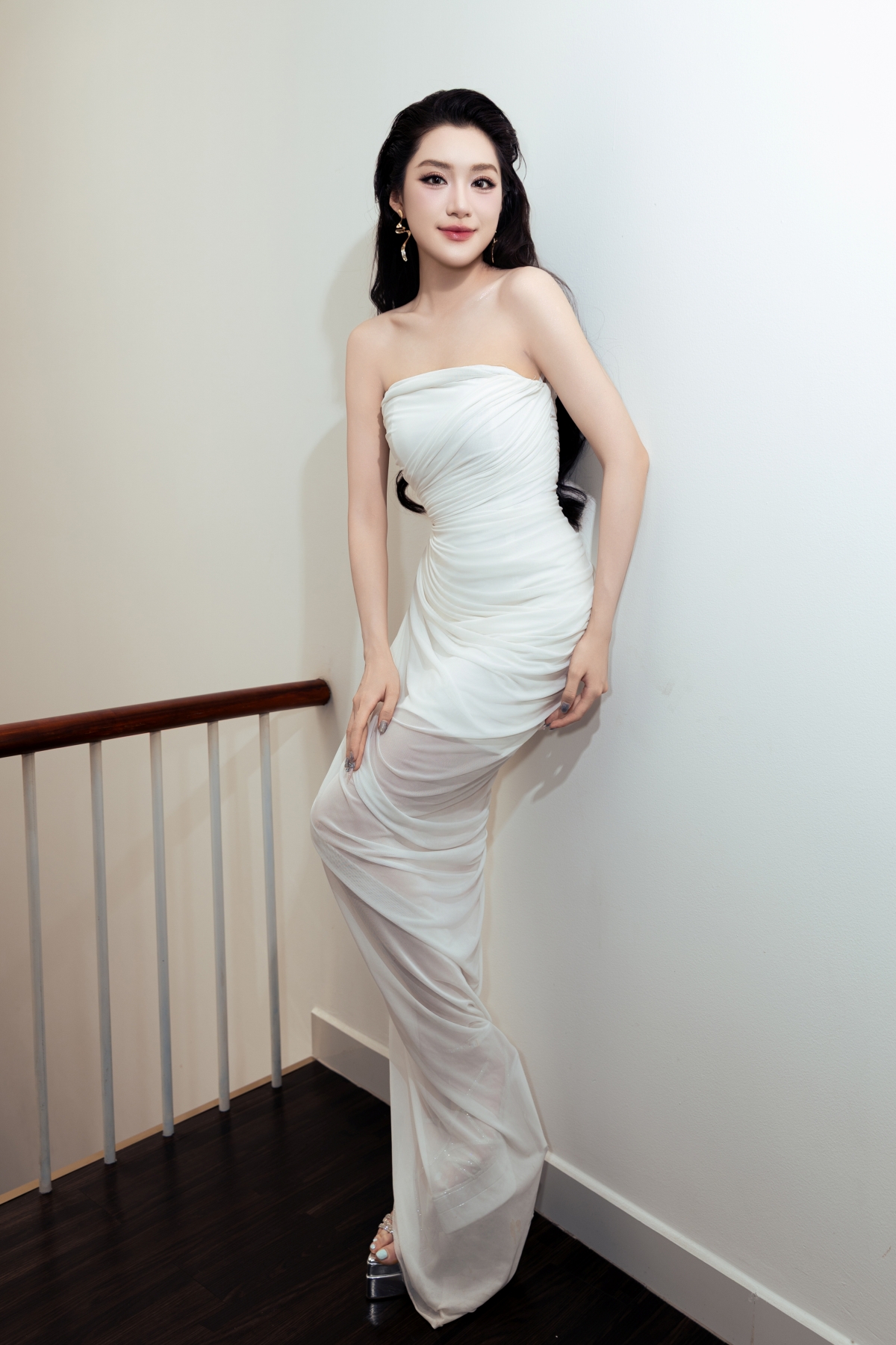 Đầm cúp ngực tôn vai trần là lựa chọn của Phan Phương Oanh ở một sự kiện hôm 1/4. Cô tiết chế phụ kiện, chỉ sử dụng bông tai bản vừa để tăng điểm nhấn.