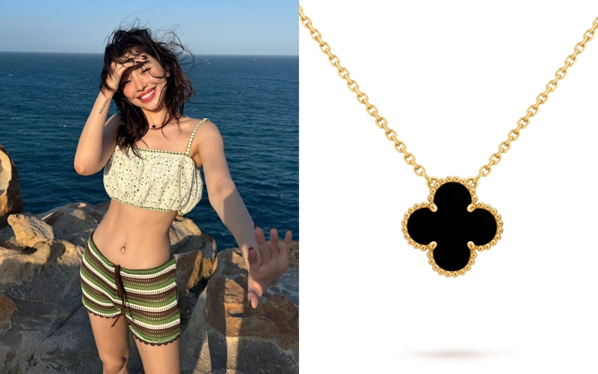 Trong chuyến du lịch cùng bạn bè ở Vĩnh Hy tháng 3, Tóc Tiên đeo vòng cổ 3.200 Euro (97,3 triệu đồng). Thiết kế bằng onyx đen – loại đá phong thủy được cho là có thể hỗ trợ chống lại năng lượng xấu, xua đuổi tà ma, tượng trưng sức mạnh, mang lại sự tập trung và lòng can đảm.